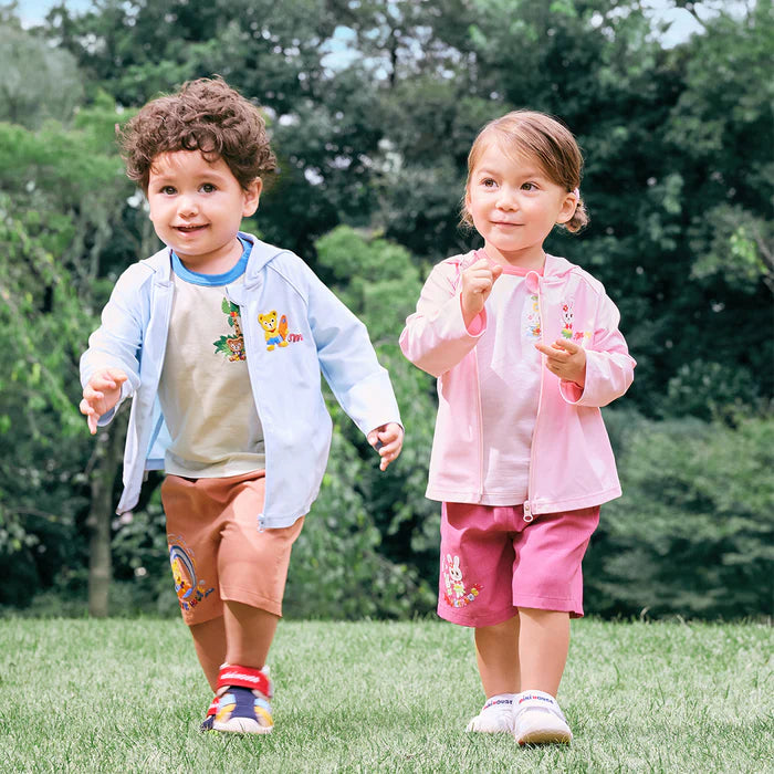 These shorts feature Puchi and Usako enjoying leisure time in a tropical setting.